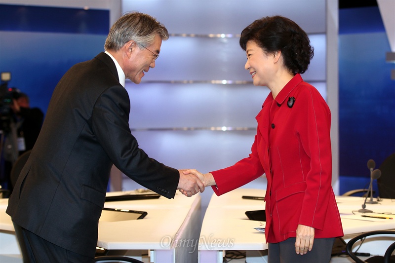 2012년 12월 16일 당시 새누리당 박근혜 대선후보와 민주통합당 문재인 대선후보가 여의도 KBS에서 열린 마지막 TV 토론회에 앞서 악수를 하고 있다.
