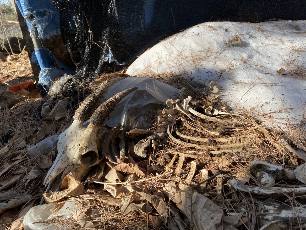 산속으로 들어가자 비닐하우스 그늘막에 걸려 죽은 산양의 뼈가 보였다.