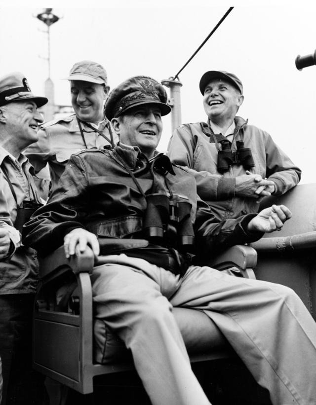 1950년 9월 15일 더글러스 맥아더 육군 원수, 참모, 휘하 사령관들이 인천상륙작전의 성공을 축하하며 함께 웃고 있다. 왼쪽부터 제임스 도일 해군 소장(TF90 사령관), 에드윈 라이트 육군 준장(극동사령부 작전참모), 맥아더, 에드워드 알몬드 육군 소장(맥아더 참모장). 미 해군 역사유산사령부