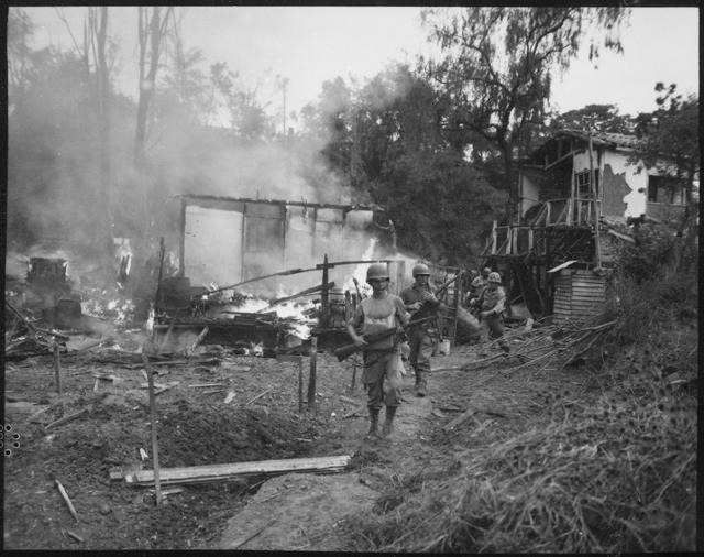 1944년 10월 20일 더글러스 맥아더 미 육군 대장이 휘하 장병들을 이끌고 필리핀 레이테섬에 상륙하고 있다. 맥아더가 2년 반 만에 필리핀을 수복한 모습을 보여준 매우 상징적인 사진이다. 위키미디어 커먼스